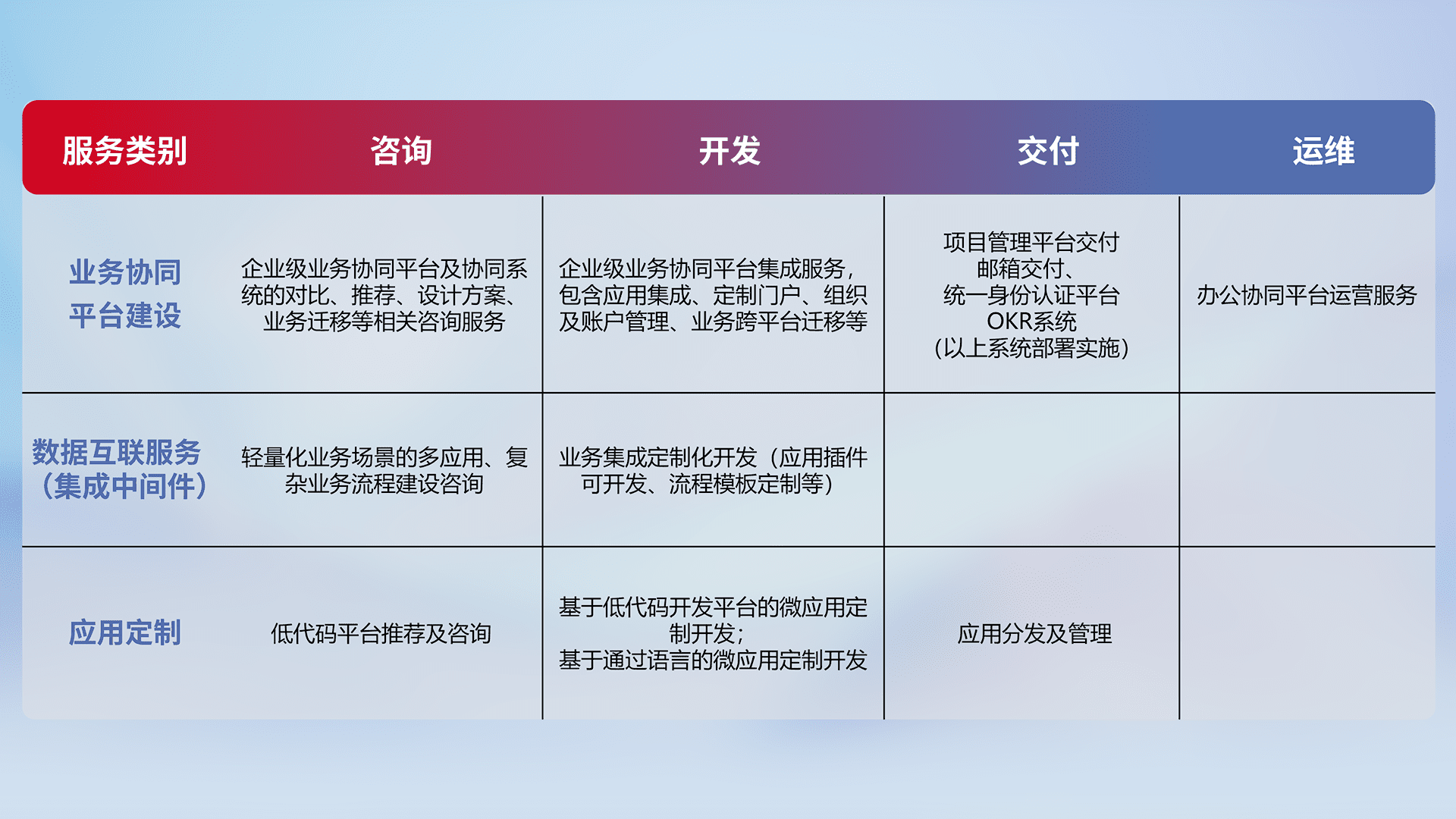 针对钉钉、、、企微、、、IDaas等平台级产品提供产品的规划、、方案、、、交付、、、、定制化开发等服务,,,实现如统一协同办公、、、智能客户服务、、、、混合会议管理、、智能数据查询、、、、等业务场景,,,,实现数字化转型。。