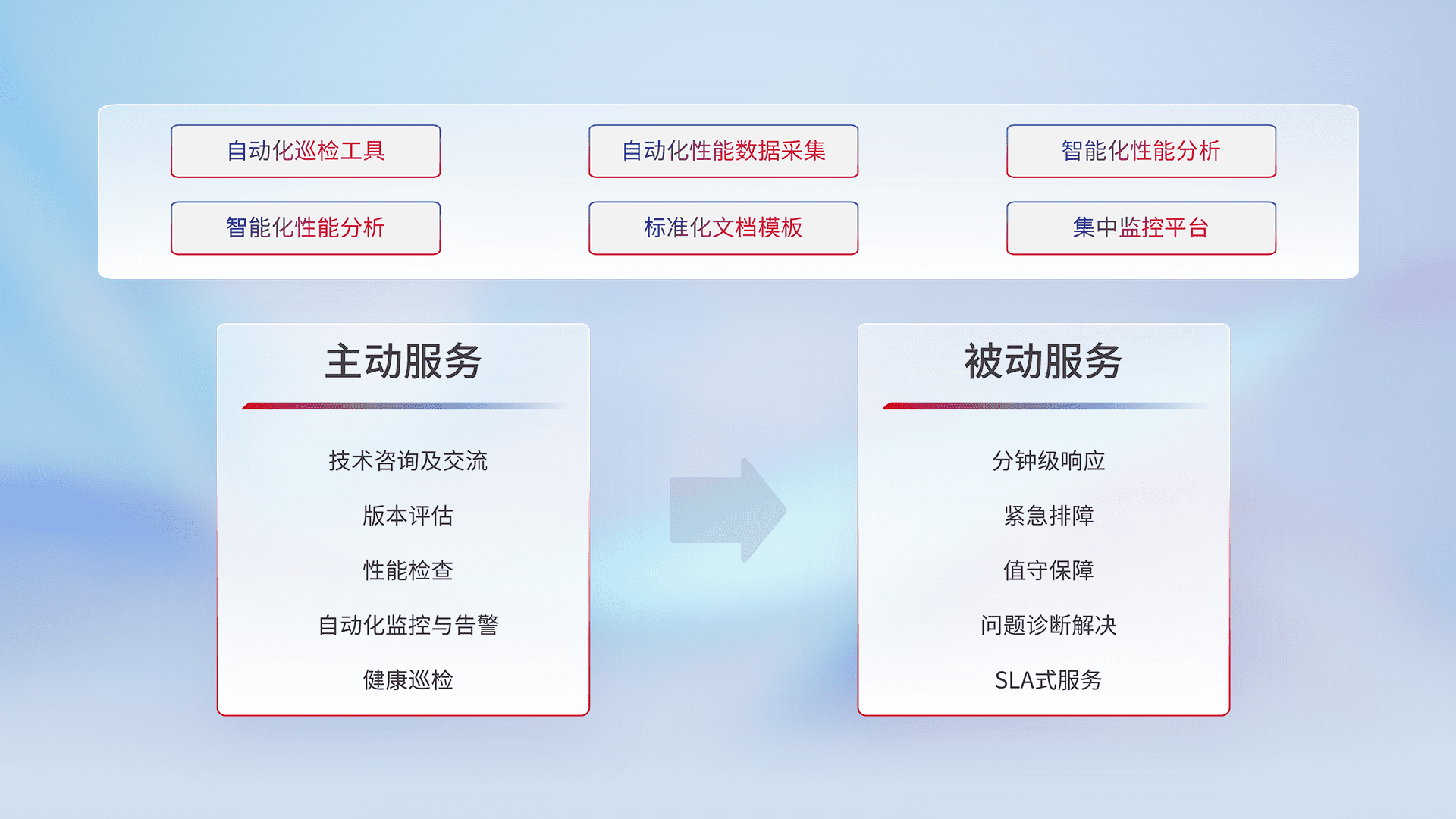 智能化工具和标准化文档,,,保障服务质量,,,,提供主动服务(包含技术咨询、、、版本评估、、、、性能检查、、、、自动化监控与告警、、健康巡检)和被动服务包含(分钟级响应、、、、紧急排障、、、、值守保障、、、问题诊断解决、、、、SLA服务)。。。